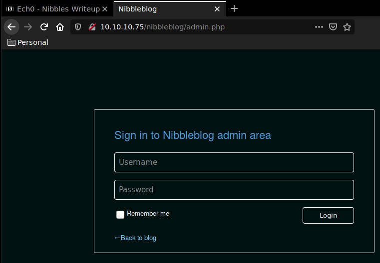 This login page has been misconfigured because fuzzing just a little with the possible default credentials we find that "admin:nibbles" is actually able to log us in !
