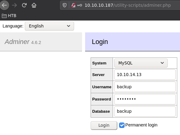 connect to [10.10.14.13] from (UNKNOWN) [10.10.10.187] 42986
