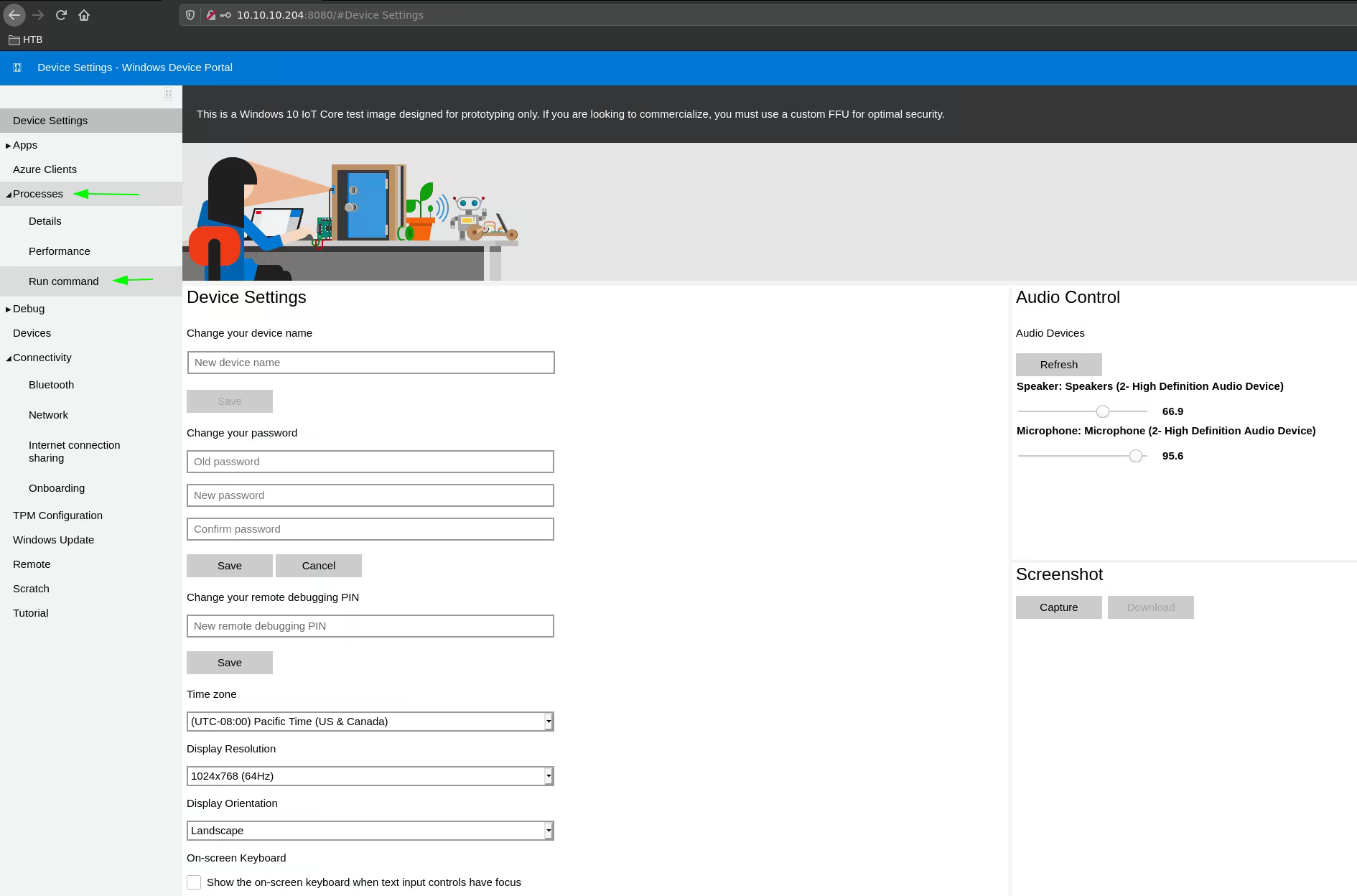 once logged in we are greeted by the Windows Device Portal, however we're interested in the command prompt: