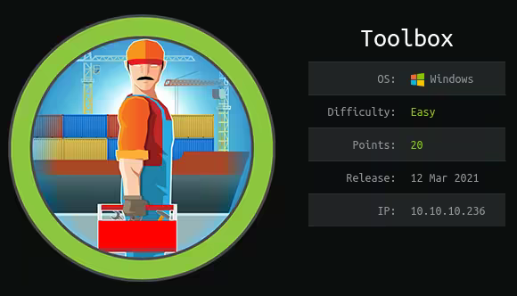 [ 10.10.14.13/23 ] [ /dev/pts/47 ] [~/HTB/Toolbox]