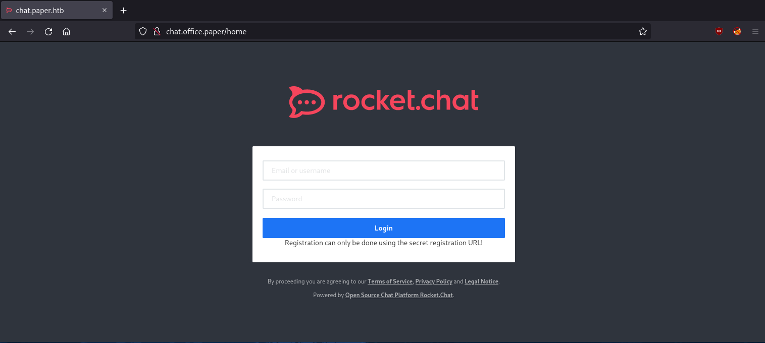 And here we find a rocketchat instance. Let's go back to it after we get credentials. We move on back to the http site with the TLD office.paper: