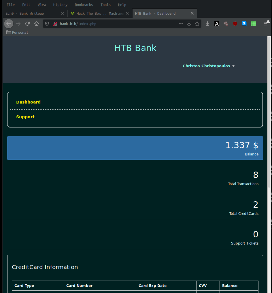 And we are logged in ! we have access to the user christos Christopoulos, the credentials worked on login.php. For our next step we navigate to the php support page that allows us to choose files to submit tickets. We will upload a malicious php file to which we will make sure that the extension ending it is not .php but something else. here we will name it nihilist.php.htb