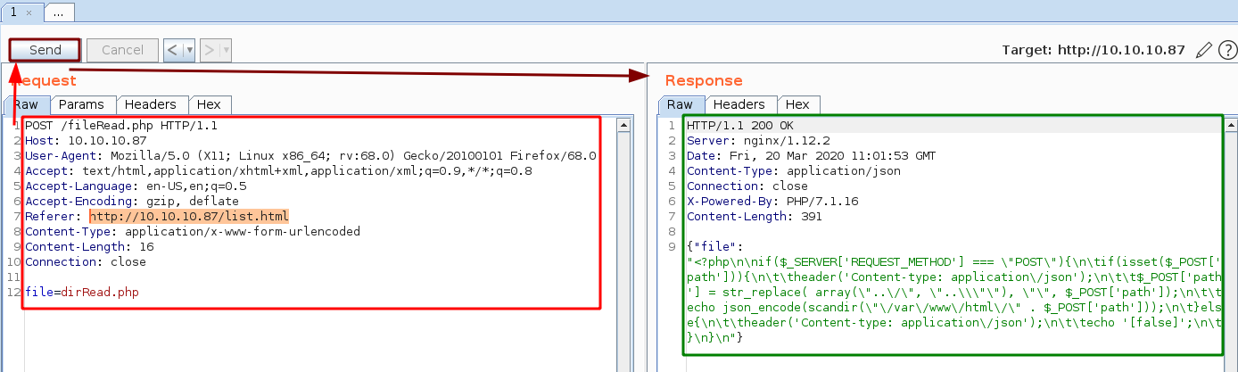 Intercept our GET request aimed at /fileRead.php and send it to burpsuite's Repeater (CTRL+R) and go there (CTRL+SHIFT+R)