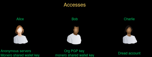 If any one of the team gets caught, the org is crippled: - Alice gets caught: no access to their infrastructure, eventually payment will lapses and the servers get deleted - Bob gets caught: no way to authenticate their communication to the outside world, claim the fame for their public actions - Charlie gets caught: no way to recruit new BOZOs