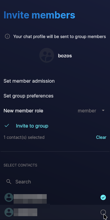 On the invite members tab that opens automatically, should which member should join the group at creation. In the present case, Alice is creating a dedicated Channel with Bob and Charlie so they can inherit her accesses should she get busted