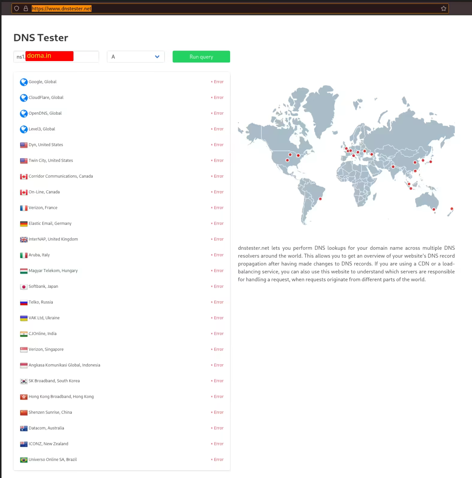 As you can see, none of the major DNS servers around the world are aware of my ns1.yourdoma.in record, therefore I need to wait for my dns record to propagate (by setting the DNS server as the DNS servers for a particular domain, on a registrar):