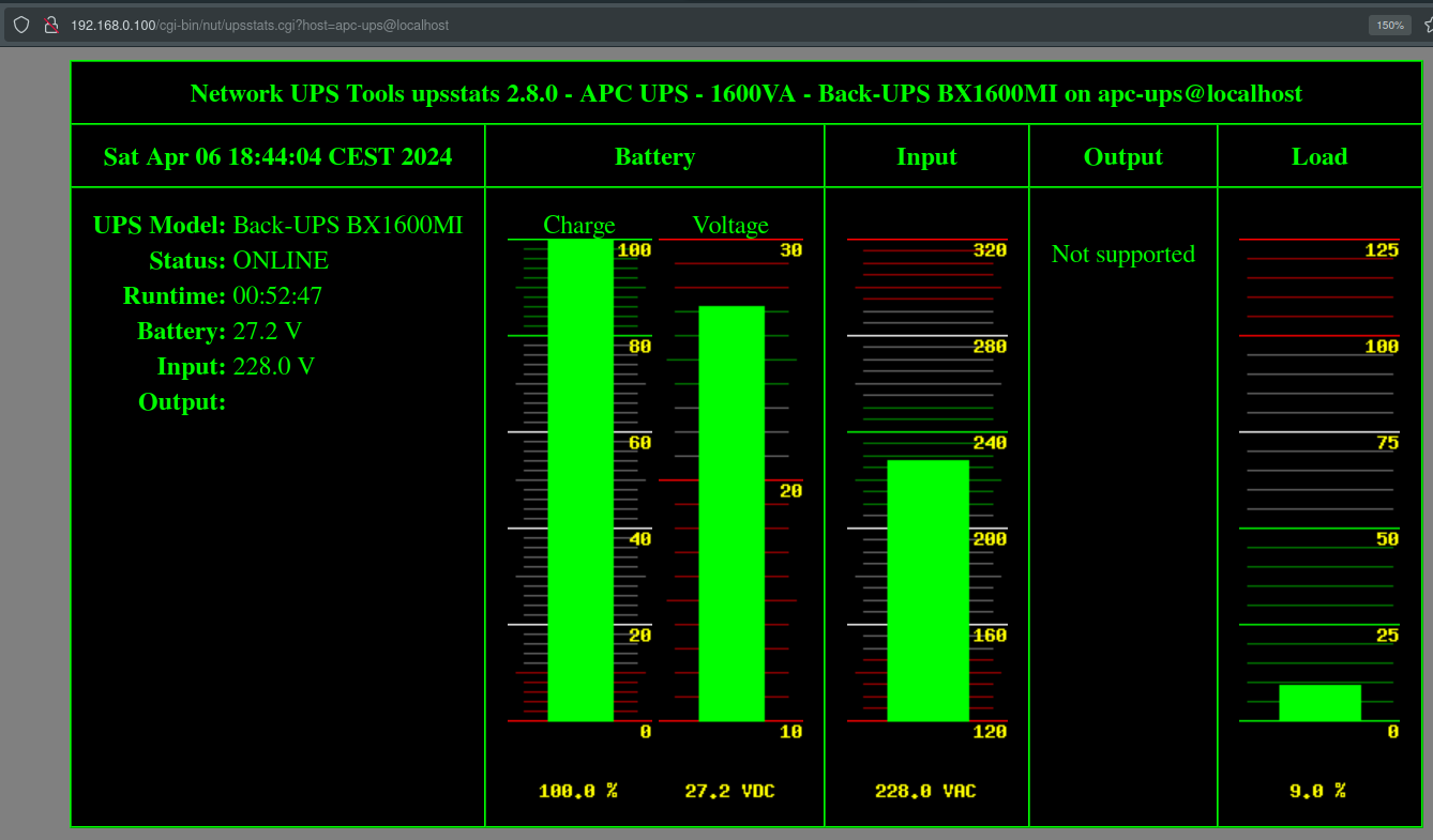 And now we can browse it from the web on port 80: the url is: http://192.168.0.100/cgi-bin/nut/upsstats.cgi?host=apc-ups@localhost &treemode;
