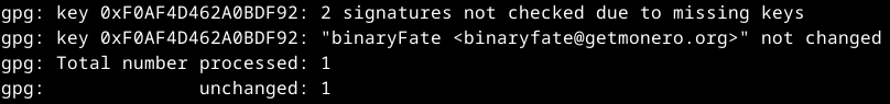 gpg --import binaryfate.ascif the public key is new and isn't saved you will get this output