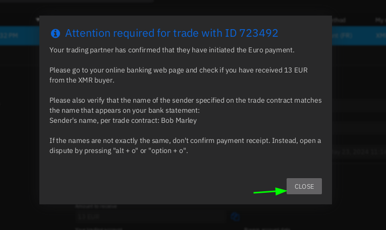 Once completed, Bob declares that he has sent payment. and in case if Alice tries to deny that she received payment, Bob can take a screenshot to prove that he has sent the payment, from his bank account by clicking on viewing more details on his transaction (checking the receipt). That way, in case if there is a dispute, (meaning if Alice tries to scam Bob), he will be on the right side of arbitration, and the Arbitrator will favor him.