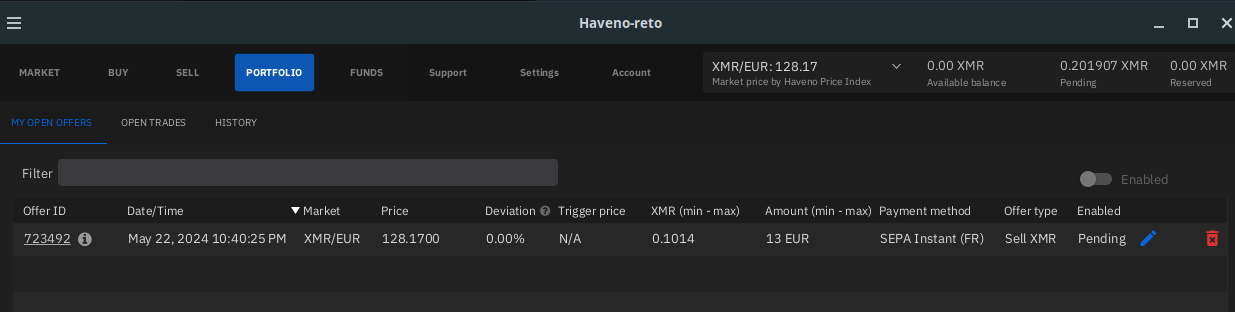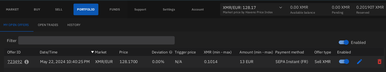 Then Alice creates the new Offer to sell her XMR: