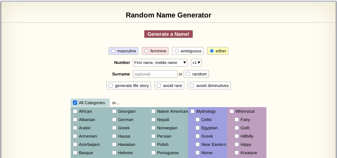 As an example, the following website allows you to generate a random name with multiple options:
