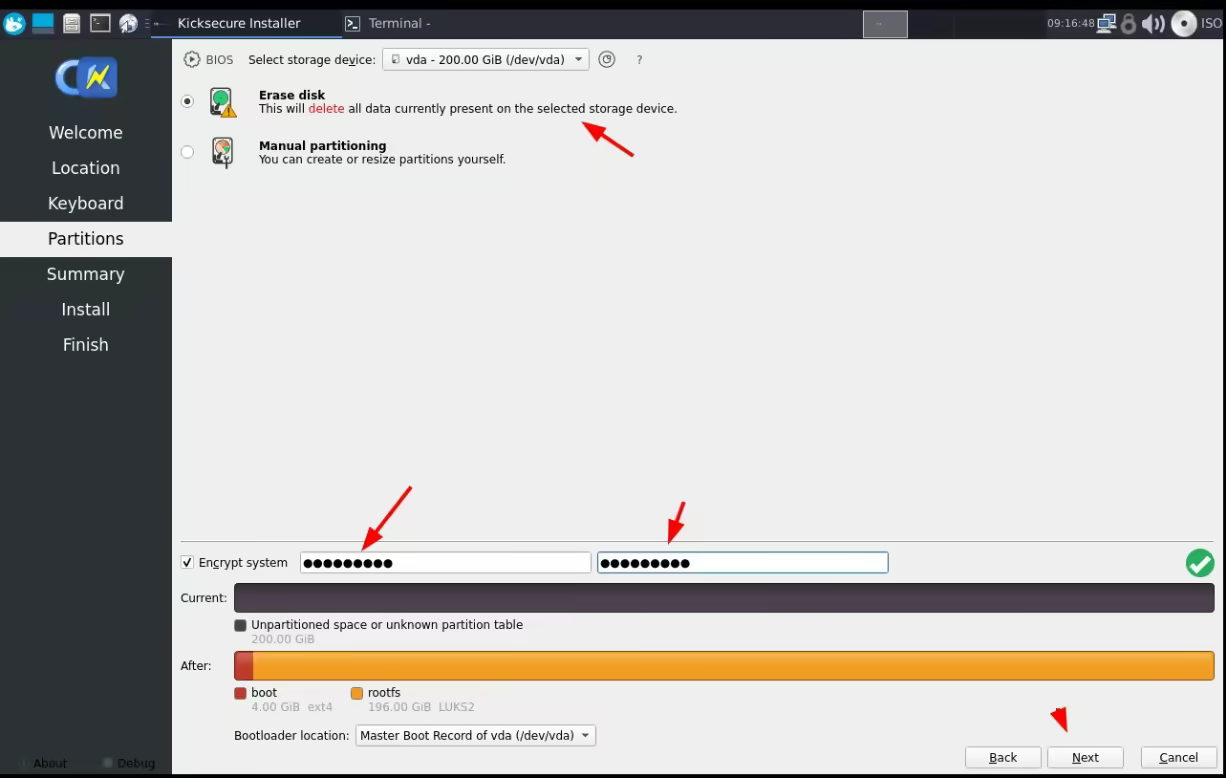 As we reboot the computer, we're greeted by the kicksecure boot screen, and then we type the password to unlock the encrypted system drive: