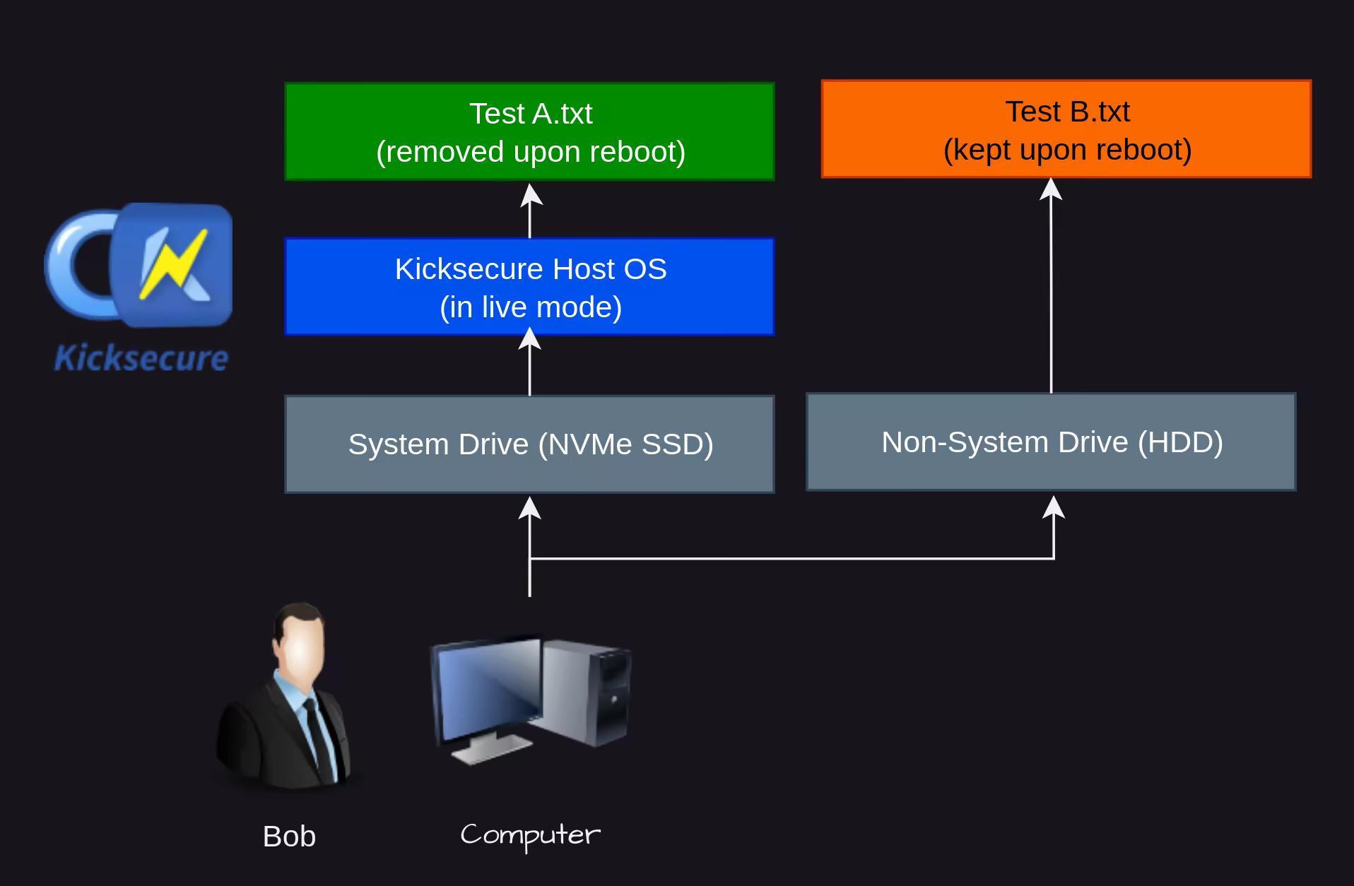 Thanks to live mode, we are able to load the entire Host OS in RAM directly , allowing us to avoid writing anything on the system disk (no system logs, no kernel logs, no non-standard logs, only ram contents to worry about)