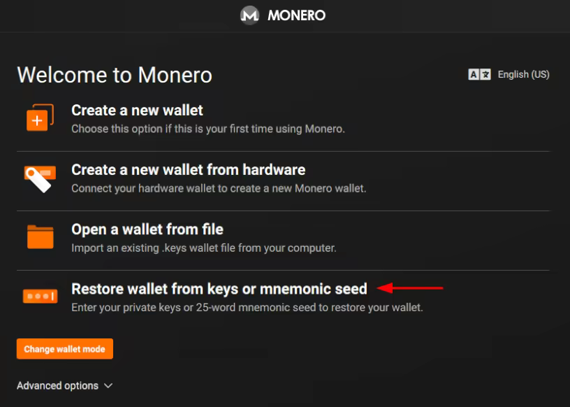 Nephew Nick opens up his Monero Wallet GUI and navigates to "Restore wallet from keys or mnemonic seed"