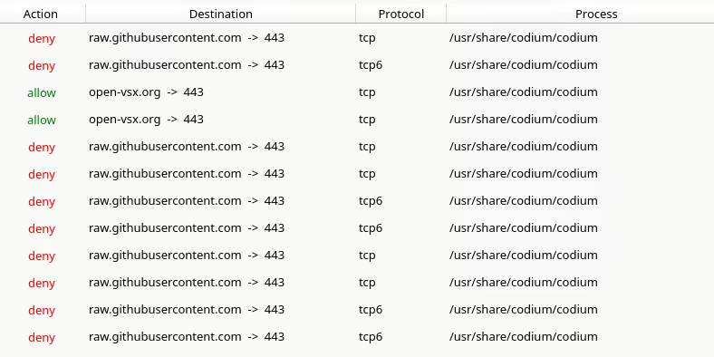 Now we're going to show you the easiest way to use OpenSnitch, by interacting with code IDE application, VS Codium. Throughout these screenshots you may see some unimportant info blocked out to preserve the this post author's privacy.