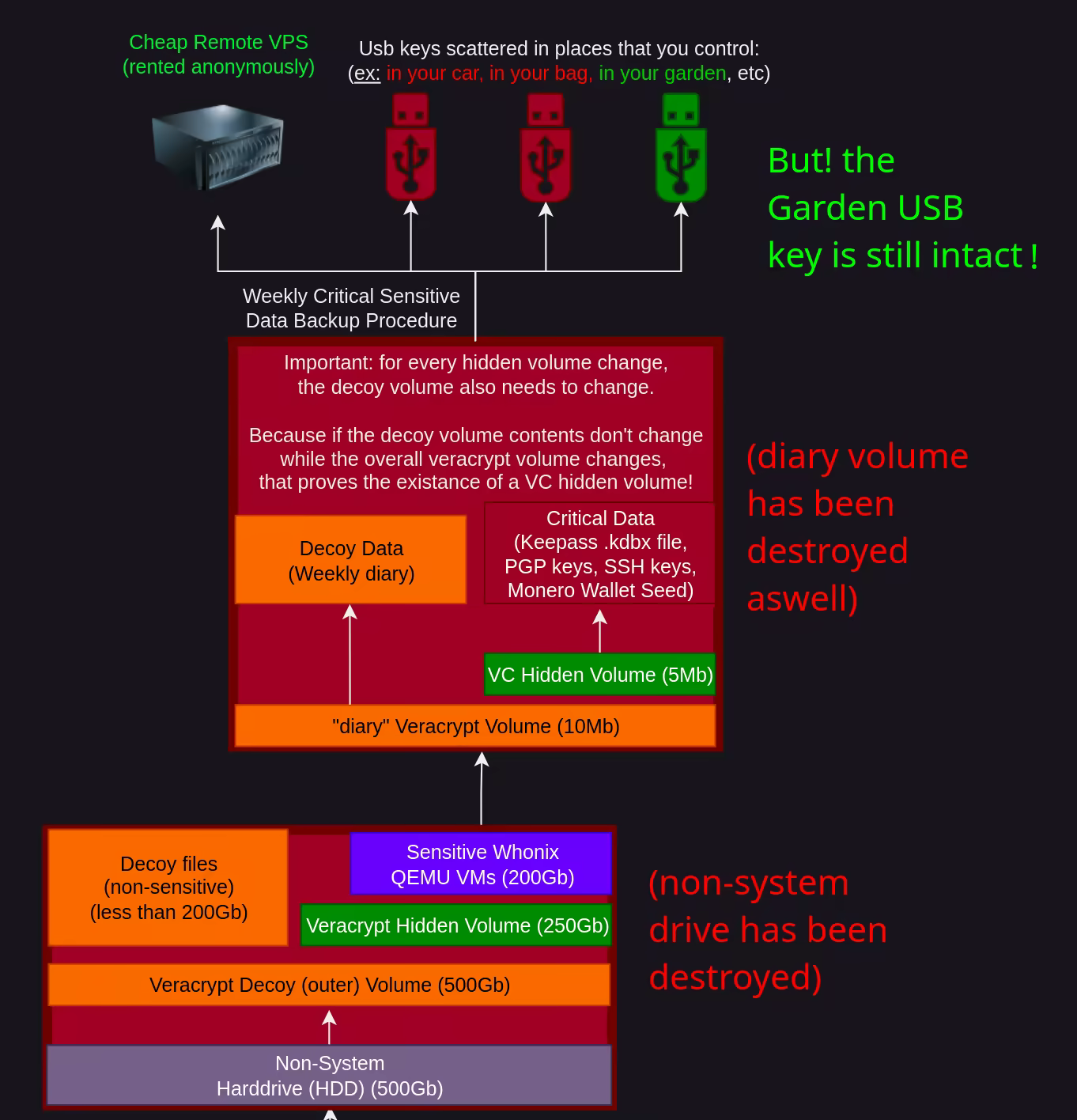 So your primary data source has been destroyed (including the sensitive VMs and the main diary VC volume), you also realize that they seized and destroyed the usb key you had in your backpack, and in your car. However upon checking further you realize that they didn't get the USB key that you hid in your garden.