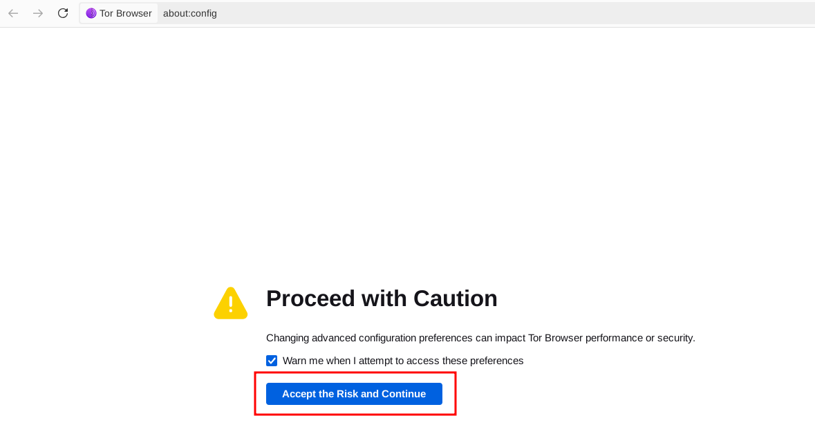 Next you need to do some changes in the tor browser, so you can access the web panel that is running on localhost (127.0.0.1), type about:config inside the address bar, accept the risk and continue: