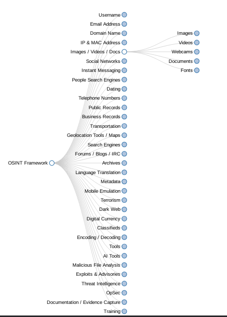 OSINT Framework is a website designed to help you find all the resources needed for OSINT investigations. It is structured as a simple tree, where each category leads to subcategories and ultimately to specific tools. For example, if you want to extract metadata from a photo, you would first select the "Images / Videos / Docs" section in the tree.