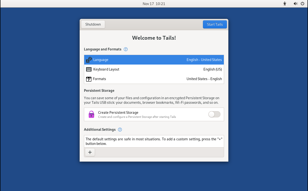 Once in there, depending on your use, you can select to have an admin password and a persistent storage if you need it. Otherwise everything you do in the VM will be wiped clean upon shutdown (hence the word amnesic).