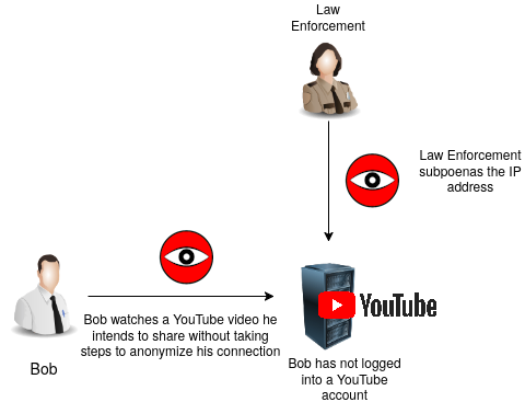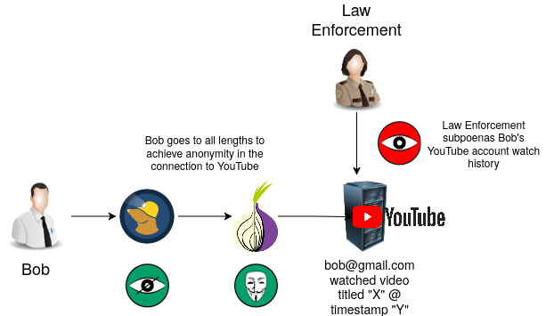 Despite taking all other precautions and not using a YouTube account, Bob has deanonymized himself. Law enforcement can use the source identity to track his watch list and build a profile of him.