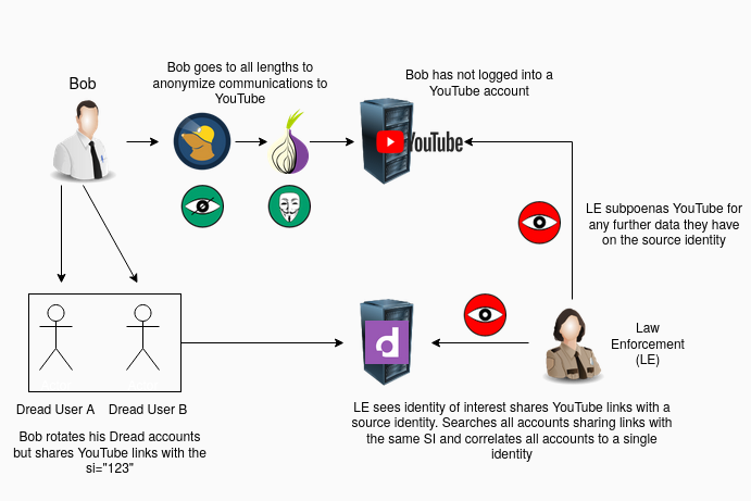Even worse, Law enforcement can search Dread for all account sharing the YouTube link with the same source identity. They now know that all these accounts belong to the same identity.