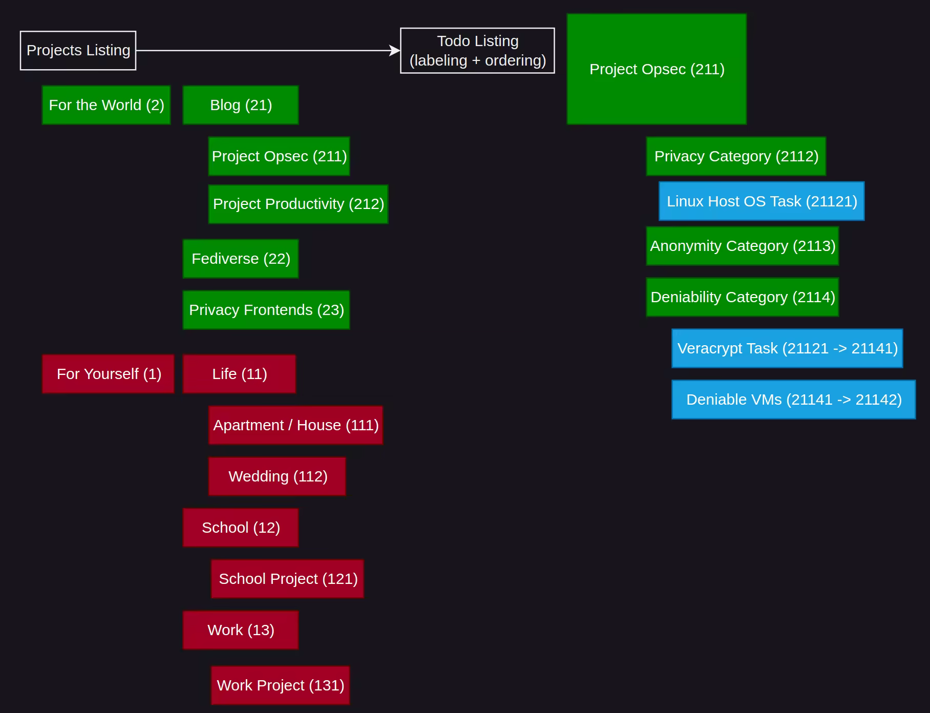 as you can see, the smaller the number, the higher level we have for the todo list. The master todolist is the 0.txt text file , it references the projects and labels them, and also labels each todo list underneath.